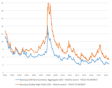 The difference between the segments is in part explained by the different nature of bond issuers. The emerging market corporate debt market is dominated by higher quality corporate issuers, while the sovereign market includes some low quality issuers.